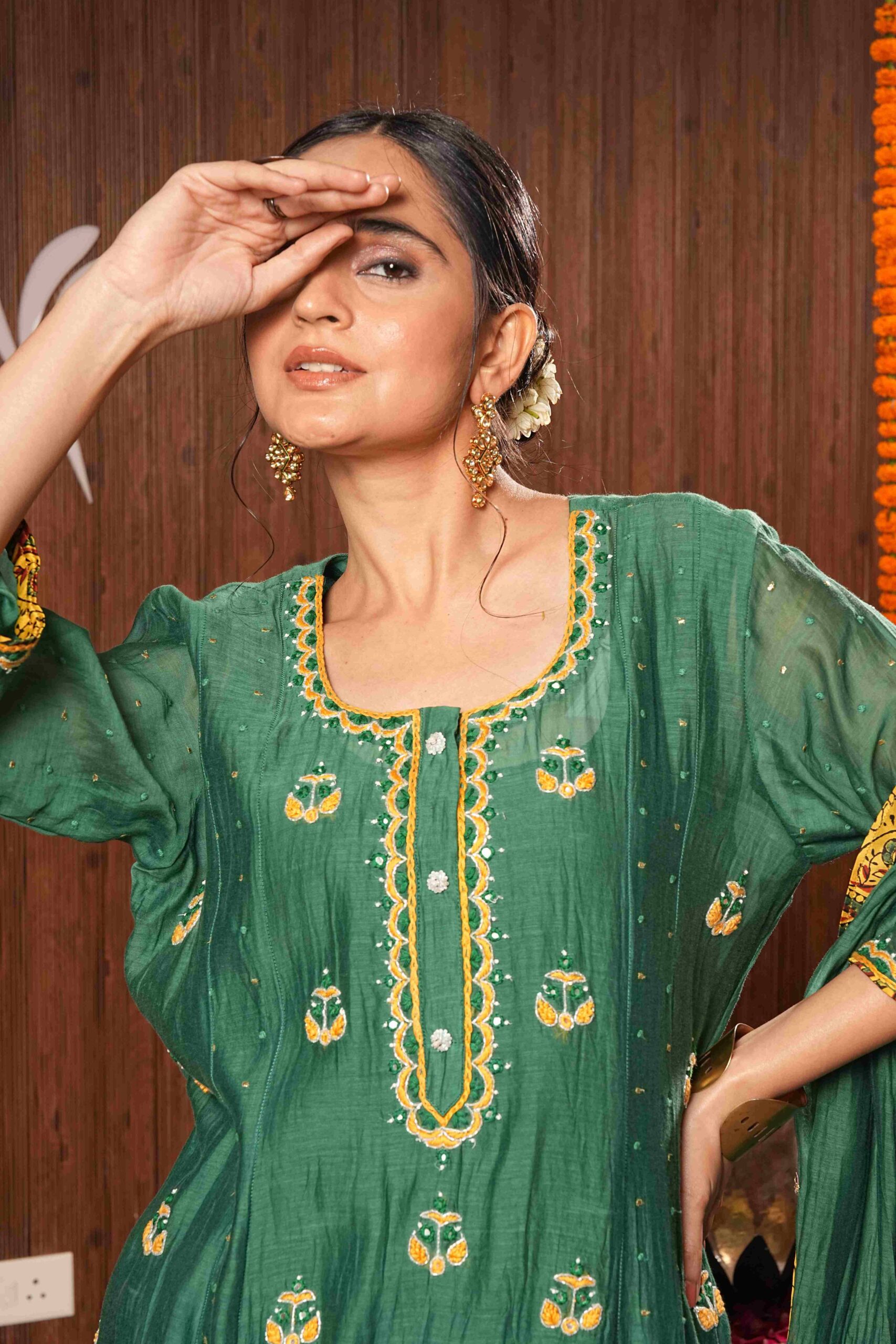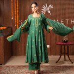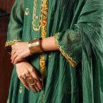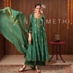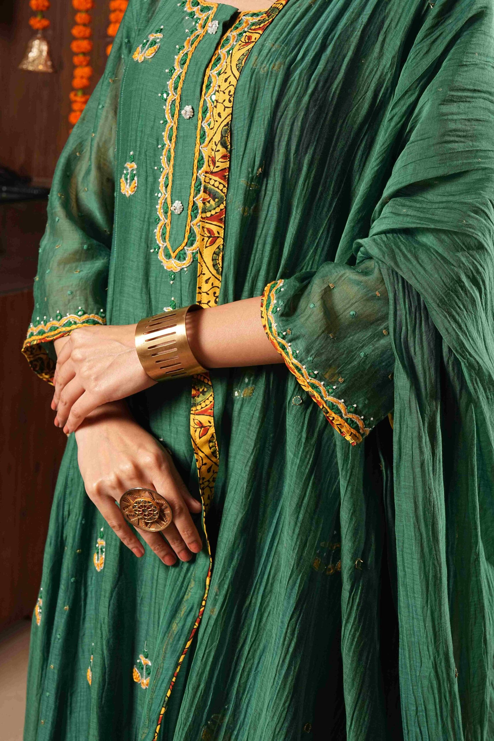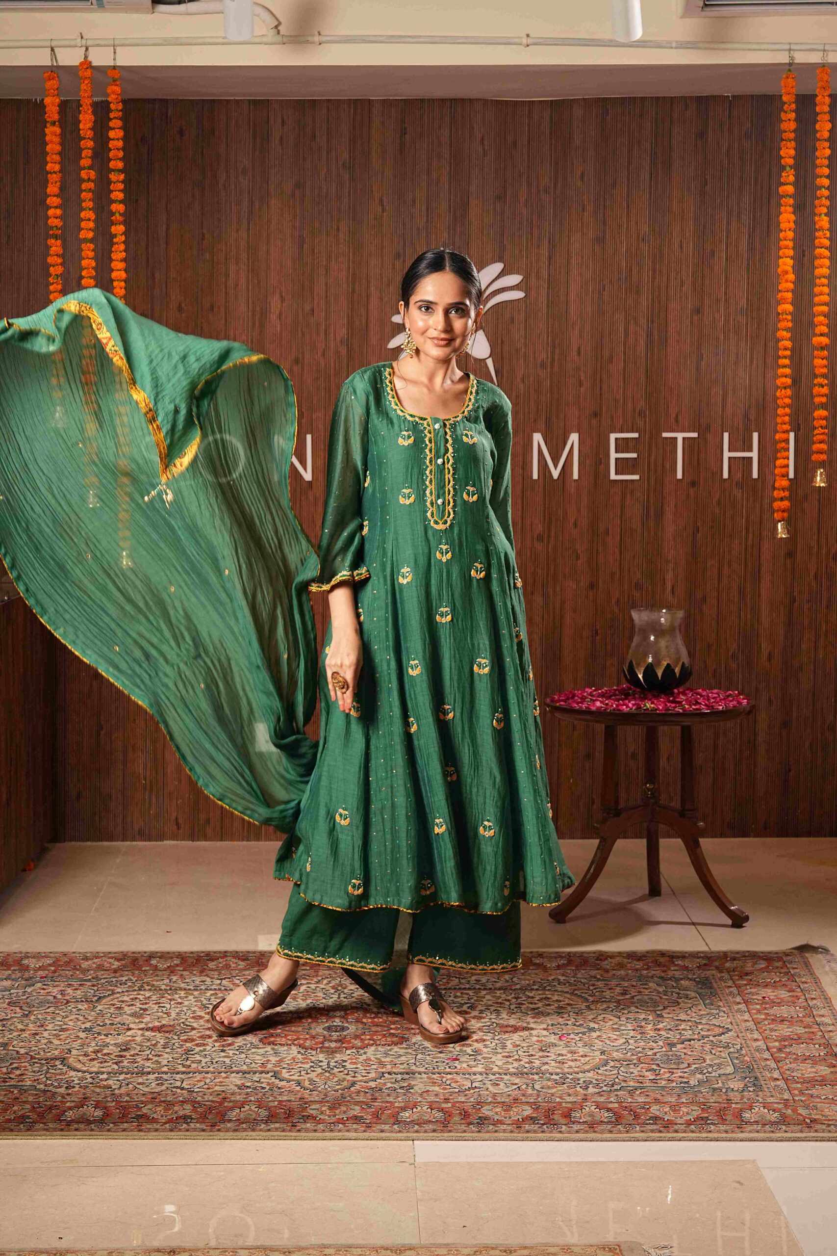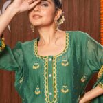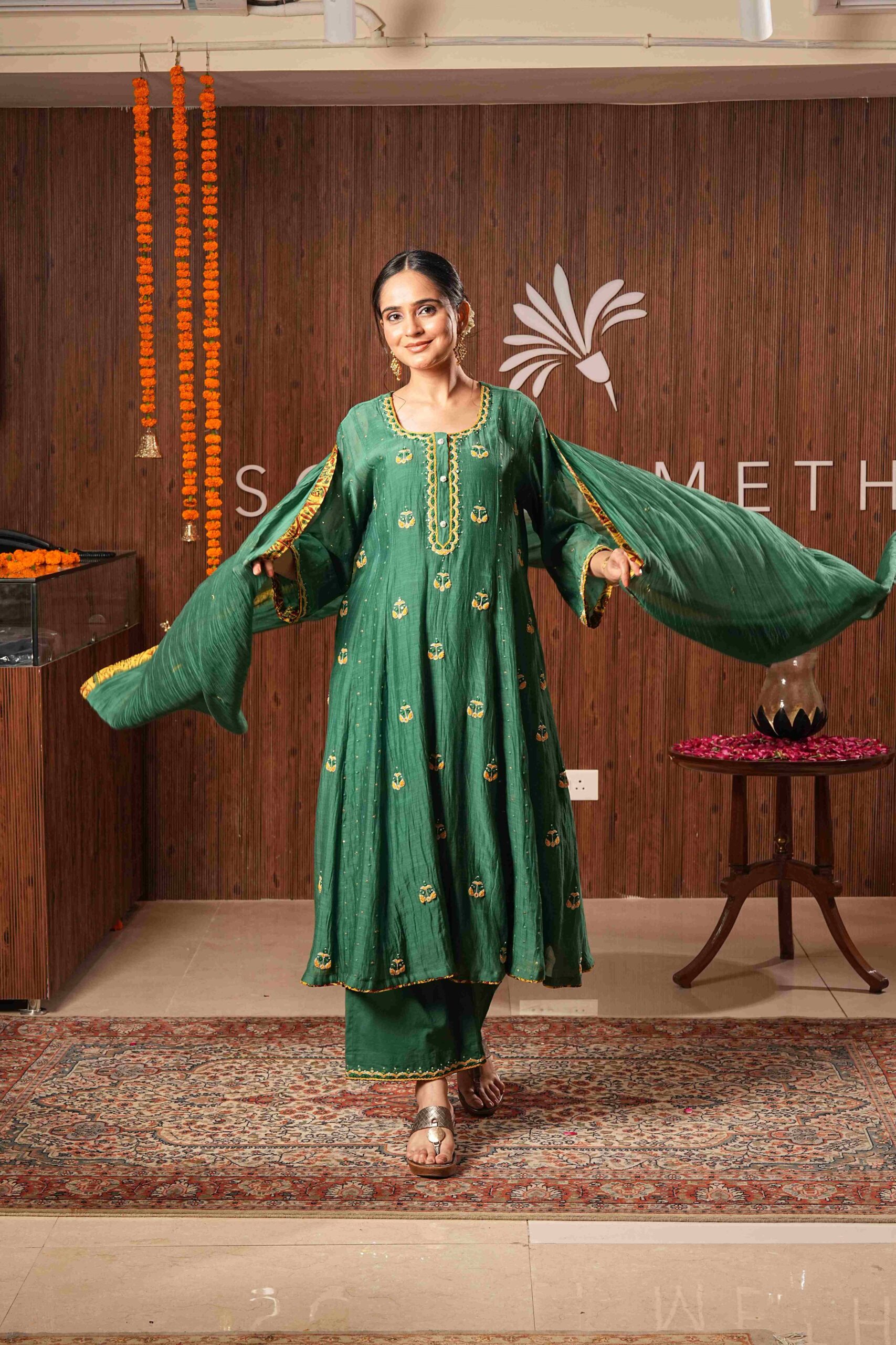 This elegant bottle green Chanderi suit set showcases exquisite hand embroidery, blending rich tradition with contemporary style. The lustrous Chanderi fabric drapes beautifully, offering a luxurious feel, while the intricate embroidery adds a refined touch. Perfect for festive celebrations or formal events, this suit set exudes timeless grace and sophistication. . . .